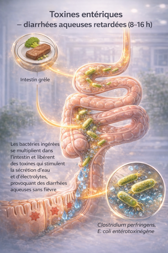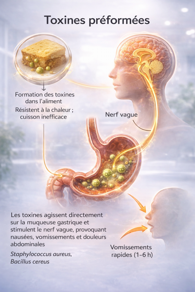 Certaines bactéries comme Staphylococcus aureus ou Bacillus cereus produisent des entérotoxines déjà présentes dans l’aliment. Ces toxines stimulent les récepteurs vagaux et le centre du vomissement, expliquant la survenue très rapide des nausées et vomissements (1 à 6 heures après ingestion), souvent sans fièvre.