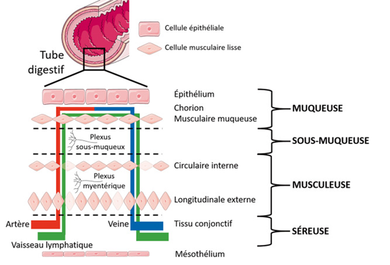 Le complexe moteur migrant repose sur une organisation anatomique spécifique de la paroi intestinale, en particulier au niveau de la musculeuse, constituée de couches musculaires lisses circulaire et longitudinale. C’est dans cette région que se situent les éléments essentiels à la génération et à la propagation des contractions caractéristiques du CMM.