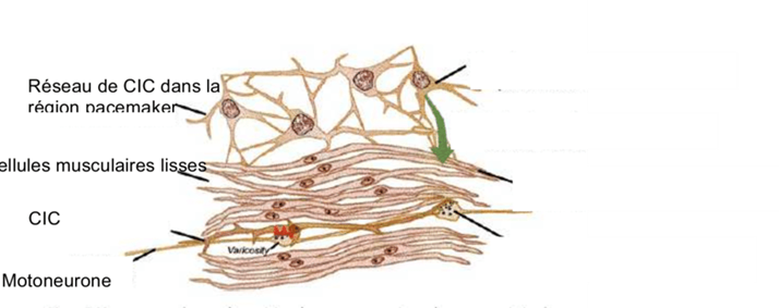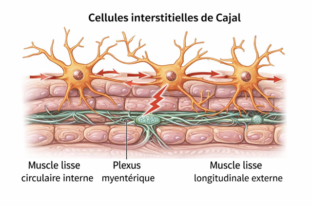Au sein de la musculeuse, et plus précisément à l’interface entre les couches musculaires, au niveau du plexus myentérique, se trouve un réseau de cellules interstitielles de Cajal. Ces cellules constituent le pacemaker intestinal. À l’image du pacemaker cardiaque, elles sont capables de générer spontanément un rythme électrique de base, qui détermine la fréquence et l’organisation des contractions musculaires impliquées dans le CMM. Ce pacemaker est intrinsèque à l’intestin : il ne dépend pas du système nerveux cérébral pour fonctionner, mais son activité peut être modulée par le système nerveux entérique et le système nerveux autonome.