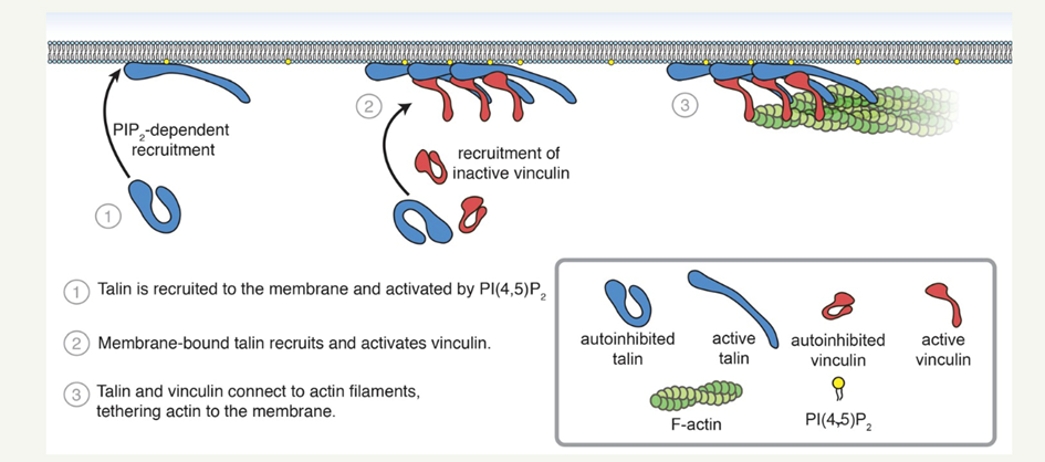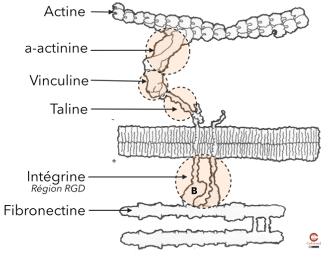 Sous l’effet de la tension mécanique, la vinculine s’active et se lie à la taline ainsi qu’aux filaments d’actine. Elle renforce l’ancrage du cytosquelette à la membrane et stabilise les adhérences focales. Ce couplage permet une transmission efficace des forces mécaniques entre les cellules musculaires lisses, assurant la continuité de la contraction des couches musculaires circulaire et longitudinale.